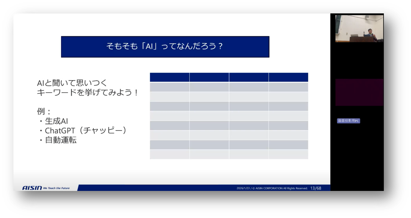 2026年1月23日(金)、1年生の共通専門科目「系導入セミナー」において、『AIと私たちのくらし』をテーマとした講義を実施しました。本科目は各系(分野)への配属を前に、機械・電気・情報・化学の各分野で必要となる基礎知識を学ぶものです。今回は、株式会社アイシンの協力のもと、AI(人工知能)の最新動向と社会実装について学びました。