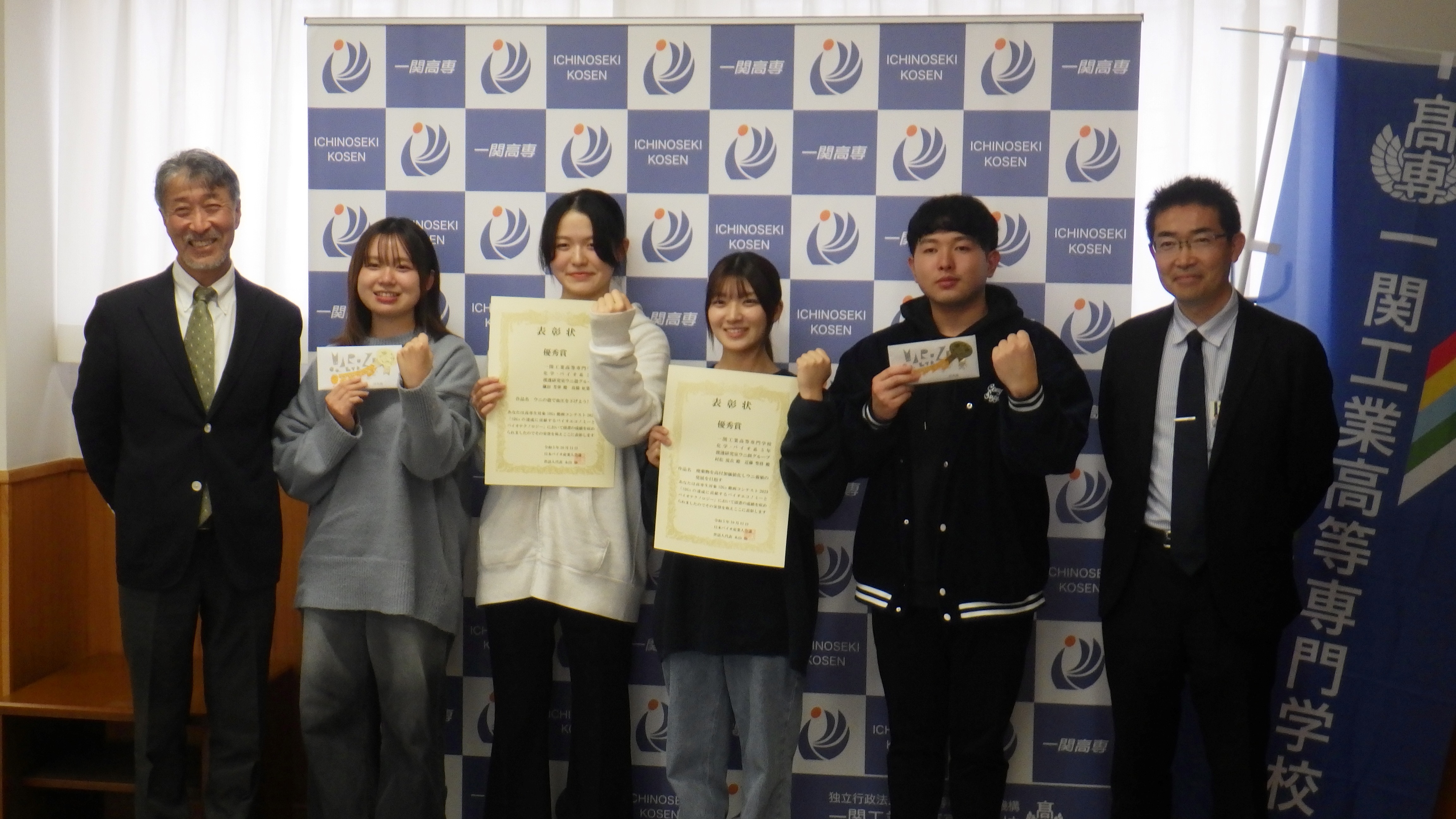 (一財)バイオインダストリー協会(JBA)及び日本バイオ産業人会議(JABEX)では,内閣府および(一社)全国高等専門学校連合会の後援のもとに,『SDGsの達成に貢献するバイオエコノミーとバイオテクノロジー』動画コンテスト2023が実施され,審査基準に基づく厳正な審査の結果,化学・バイオ系5年の4名の学生が作成,応募した2作品が優秀賞に選ばれました。この表彰式が11月6日(月),校長室にてオンライン形式で行われました。