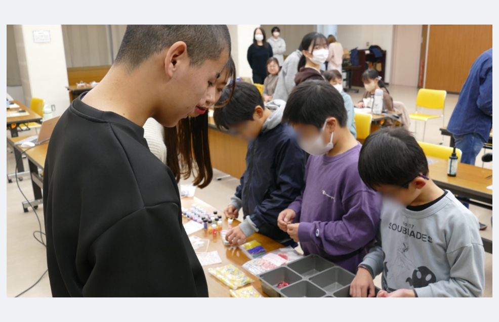 まず、STEAM-nitic が「ものづくりでエコを学ぼう」を担当し、廃棄材料を活用したオリジナルアクセサリー作りを通して、SDGsやアップサイクルについて学びました。