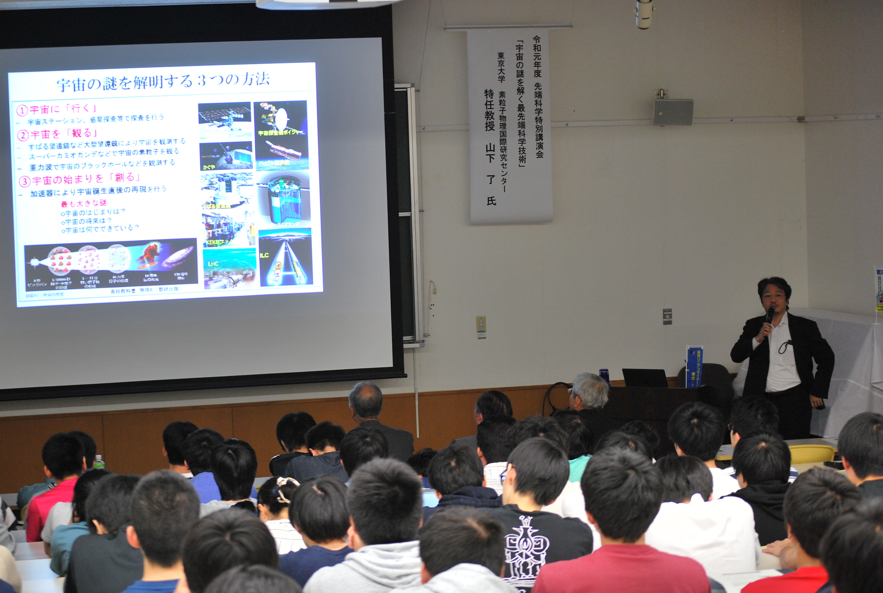 東京大学素粒子物理国際研究センターの山下了特任教授を講師に迎え、「宇宙の謎を解く最先端科学技術」という題目で講演を行っていただきました。講演会では、最先端科学に理解を深めてもらおうと、次世代の大型加速器「国際リニアコライダー(ILC)」の研究内容や素粒子物理の特徴などを解説、「研究・開発をリードするためには悩む癖が必要だ。インターネットですぐに調べるのではなく、自分で考え、悩んでほしい」と学生にアドバイスが送られました。