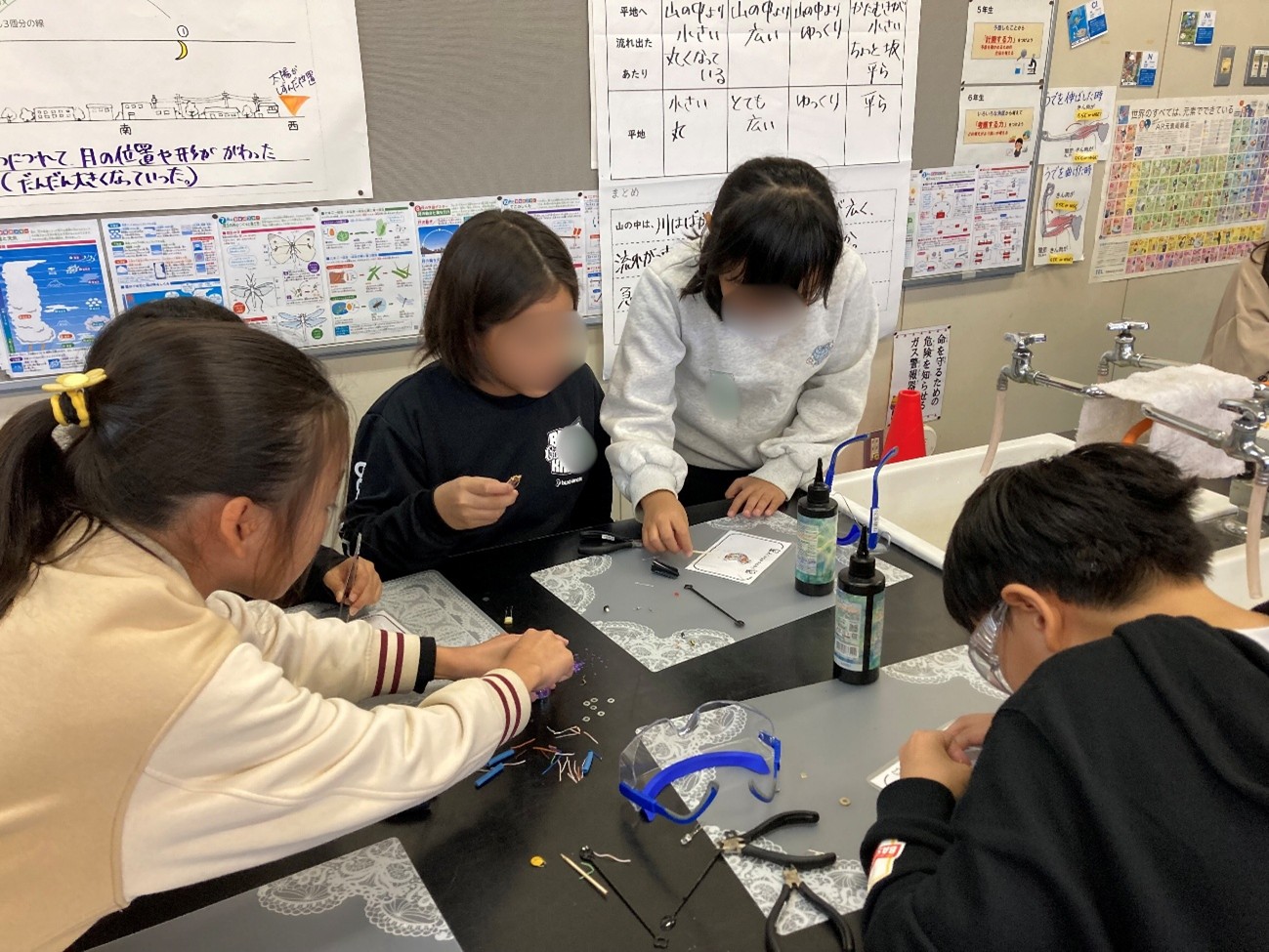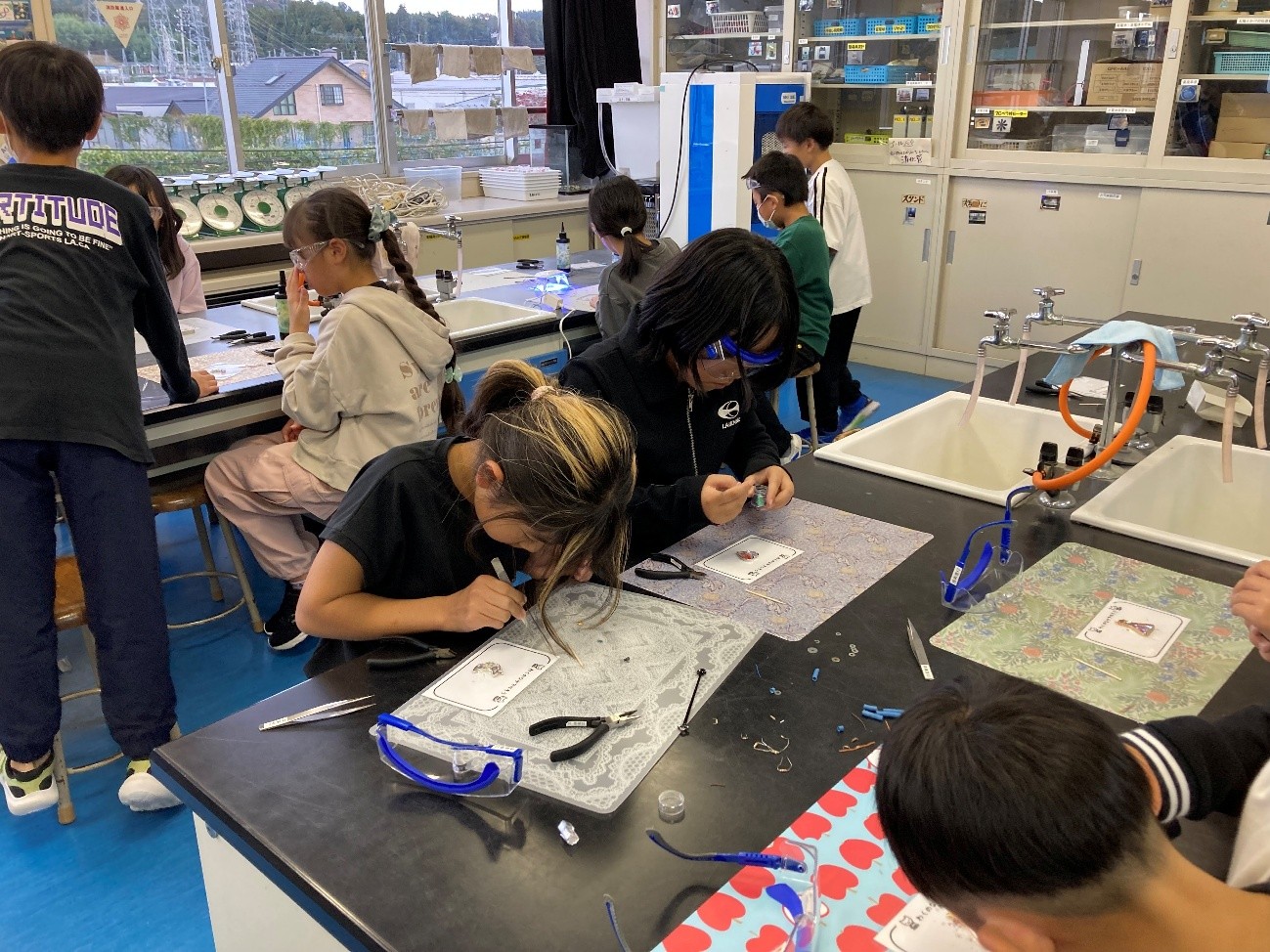 まず、「アップサイクル〜SDGs時代に必要なこと〜」をテーマに講義を行い、その後、廃棄部品から取り出した電子部品やワッシャーをUVレジンで固めて、オリジナルのキーホルダーづくりに挑戦しました。